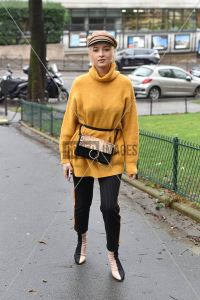 Keywords: #Bershka,#Chloe,#PHC,#ParisHauteCouture,#Zara,Bershka pants,Chloe bag,Haute Couture Fashion Week,Haute Couture Fashion Week Spring 2018,Paris Haute Couture,Paris Haute Couture Spring 2018,Paris street fashion,Stradivarius sweater,Zara heels,Zara shoes,baker boy hat,brown hat,colored sweater,fanny pack,full length,funnel collar,funnel collar sweater,heeled boots,snakeskin bag,street fashion,street style,two tone boots,two tone heels,waist bag,waist pack,yellow sweater