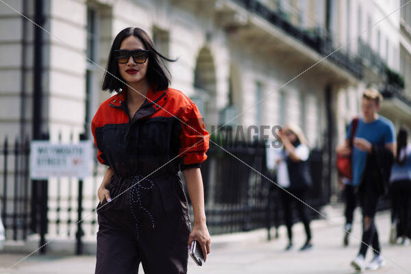 Keywords: #Ganni,#LFW,#LondonFashionWeek,Ganni jumpsuit,LFW,London Fashion Week Spring 2019,London street fashion,LondonFashionWeek,Tiffany Hsu,black hair,black sunglasses,blue and red jumpsuit,blue and red top,bob hairstyle,cell phone,half length,middle part,red lips,red lipstick,ruched sleeves,straight hair,street fashion,street style,tie waist,zipper front