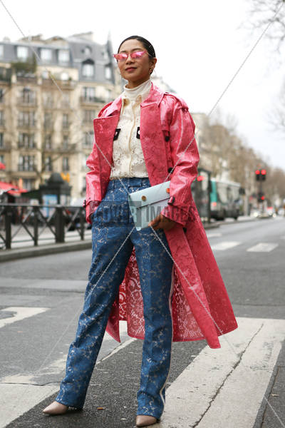 Keywords: #PFW,#ParisFashionWeek,PFW,Paris Fashion Week Fall 2018,Paris Fashion Week,Paris street fashion,below the knee coat,black hair,blue pants,colored coat,colored pants,dark hair,fashion week,floral lace,full length,lace coat,lace pants,lace top,matrix style sunglasses,mirrored sunglasses,pink coat,shades,street fashion,street style,sunglasses,sunnies,tea length coat,white clutch,white top,white turtleneck