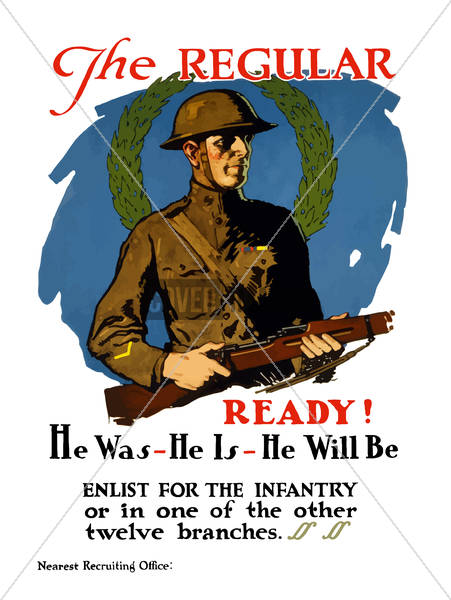Keywords: digital enhancement,poster,propaganda,past,old-fashion,illustration,advertisement,vintage,military,illustration technique,hat,laurel,standing,motivation,American History,guidance,advice,form of communication,social issues,20th century style,war effort,front view,white background,communication,waist up,pride,rifle,holding,patriotism,war,color image,western script,text,old,history,vertical,one person,one man only,wreath,uniform,vector,World War One,WWI,World War I,adult,retro