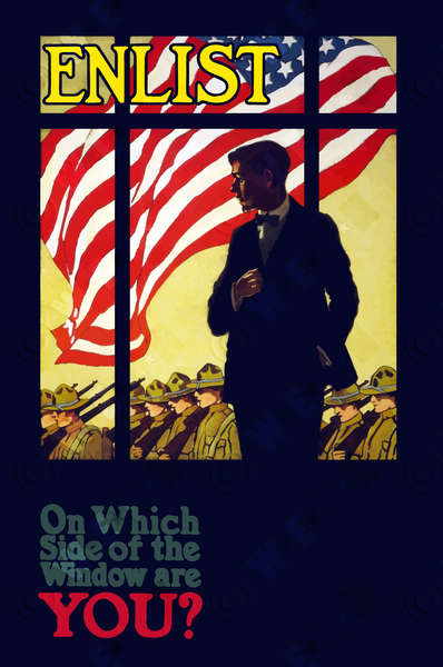 Keywords: digital enhancement,poster,propaganda,past,old-fashion,illustration,advertisement,vintage,military,indoors,illustration technique,soldier,three quarter length,watching,window,decision,flag,motivation,American History,American Flags,determination,guidance,advice,form of communication,social issues,20th century style,war effort,communication,pride,patriotism,old,color image,western script,text,war,The Great War,World War One,history,vertical,incidental people,one person,one man only,World War I,WWI,vector,adult,retro
