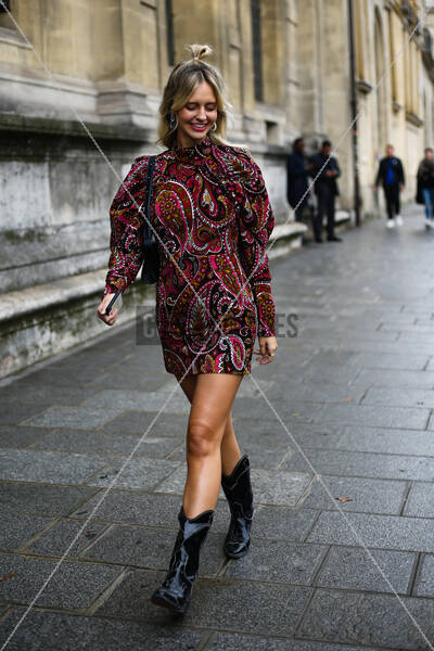Keywords: #PFW,#ParisFashionWeek,PFW,Paris Fashion Week,Paris Fashion Week Spring 2020,Paris street fashion,Paris street style,above the knee dress,black boots,blonde,blonde hair,calf length boots,cowboy boots,fall style,full length,long sleeve dress,long sleeves,loose tendrils,middle part,mini dress,multi colored dress,paisley pattern,paisley print dress,pink and black dress,puffy shoulders,street fashion,street style,top knot