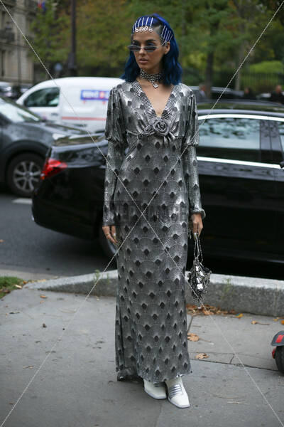 Keywords: #PFW,#PacoRabanne,#SitaAbellan,PFW,Paco Rabanne Dress,Paco Rabanne Iconic 1969 bag,Paco Rabanne bag,Paco Rabanne purse,Paris Fashion Week,Paris Fashion Week Spring 2020,Paris street fashion,Sita Abellan,applique bodice,black and silver dress,blue hair,chain mail bag,chain mail purse,chain strap bag,chain strap purse,choker,dyed blue hair,dyed hair,fashion week,floor length dress,floral applique bodice,full length,gold ring,hair clips,heeled boots,long sleeve dress,long sleeved dress,long sleeves,matrix style sunglasses,metallic dress,metallic silver bag,metallic silver purse,shades,shoulder length hair,silver and black dress,silver bag,silver purse,soft waves,square toe boots,square toe shoes,statement hair,street style,sunglasses,sunnies,v neck dress,v neck neckline,white boots,white shoes