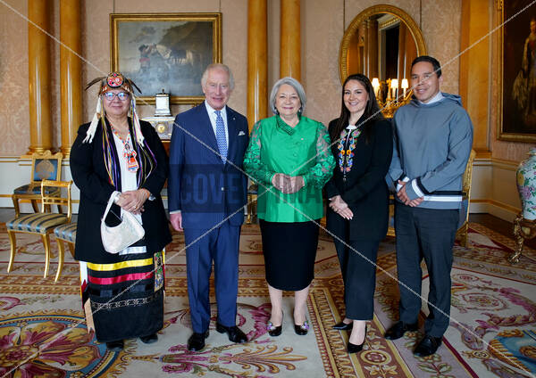 PersonInImage: King Charles III receives, Roseanne Archibald (left) National Chief, Assembly of First Nations, H.E. The Rt Hon, Mary Simon, Governor General of Canada, Cassidy Caron (second right), President, National Metis Council and Natan Obed (right) President of Inuit Tapirlit Kanatami.