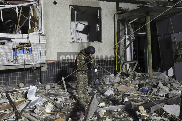 A serviceman with a torch searches the ground outside a section of a nine-storey residential building destroyed by a Russian glide bomb, Kharkiv, northeastern Ukraine. An 11-year-old boy was killed and 34 residents were injured in the bombing.