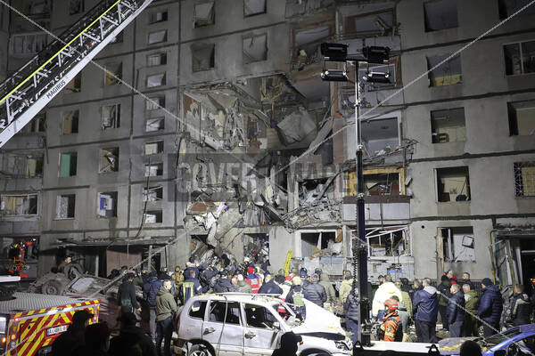 A search and rescue effort is ongoing outside a section of a nine-storey residential building destroyed by a Russian glide bomb, Kharkiv, northeastern Ukraine. An 11-year-old boy was killed and 34 residents were injured in the bombing.