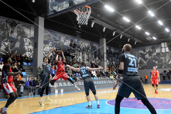 PersonInImage: Players of BC Dnipro (blue kit) and BC Rivne (red kit) are seen in action