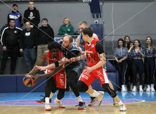 PersonInImage: Forward Roderick Brown (L) of BC Rivne and forward Stanislav Tymofeienko (2nd L) of BC Dnipro are seen in action