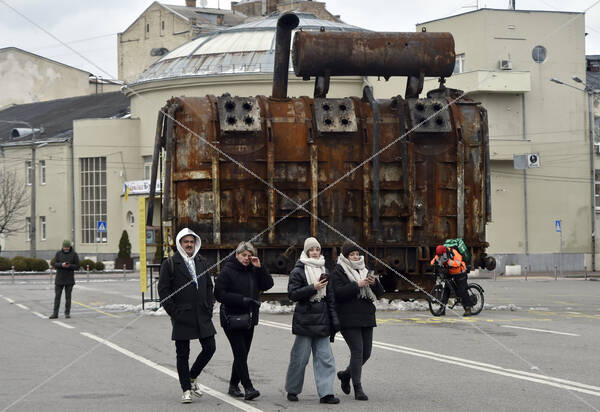 People walk past the Battle for Light installation featuring a power transformer destroyed by Russian rocket attacks