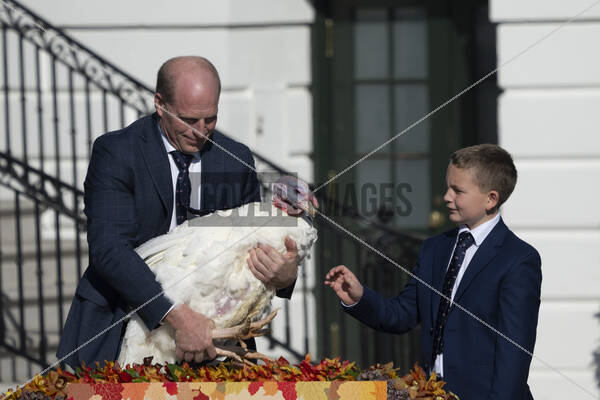 Peach the National Thanksgiving Turkey is placed by John Zimmerman, chair of the National Turkey Federation and his son, Grant, for his pardoning at the White House