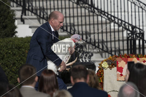 Peach, the National Thanksgiving Turkey is placed for his pardoning by John Zimmerman, chair of the National Turkey Federation at the White House