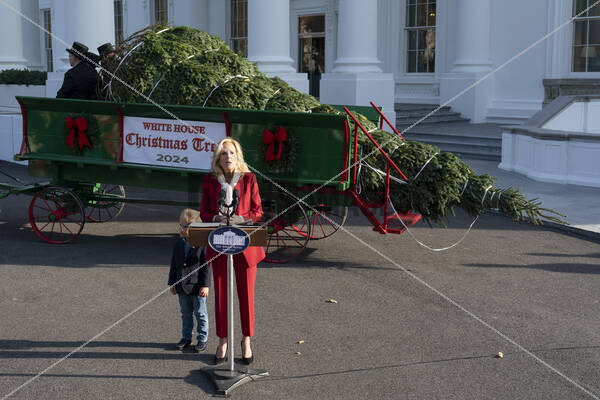 First Lady Dr. Jill Biden receives the official 2024 White House Christmas Tree, an 18.5 foot Fraser Fir from Newland, North Carolina at the White House