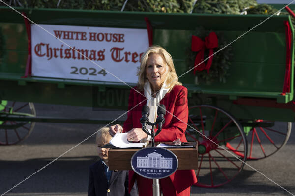 First Lady Dr. Jill Biden receives the official 2024 White House Christmas Tree, an 18.5 foot Fraser Fir from Newland, North Carolina at the White House