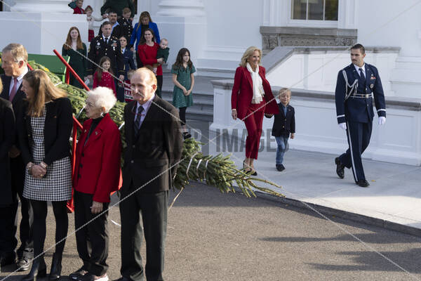 First Lady Dr. Jill Biden receives the official 2024 White House Christmas Tree, an 18.5 foot Fraser Fir from Newland, North Carolina at the White House