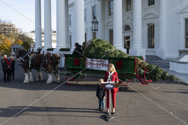 First Lady Dr. Jill Biden receives the official 2024 White House Christmas Tree, an 18.5 foot Fraser Fir from Newland, North Carolina at the White House