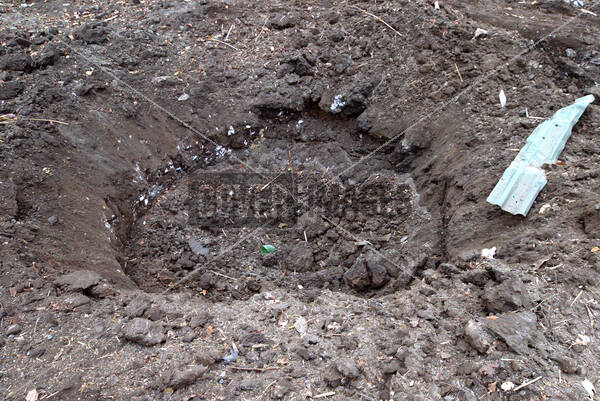 A shell crater caused by a Russian guided missile strike on the village of Yasnohirka near Kramatorsk, Donetsk region, eastern Ukraine