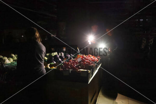 Keywords: Ukraine conflict,Russian invasion,Ukraine war,war,conflict,Russia-Ukraine war,business,supermarket,food,economy,power supply,blackout,power outage,power cut,dark,shop,Kyiv,vegetable,light,flash