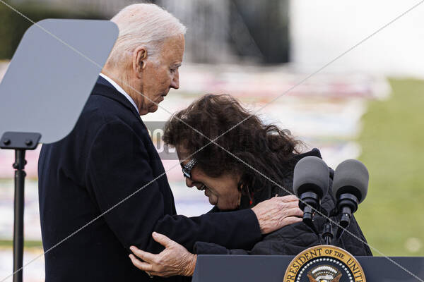 Jeanne White-Ginder, mother of AIDS victim Ryan White, is comforted by United States President Joe Biden during an event to commemorate World AIDS Day on the South Lawn of the White House in Washington, DC, US, on Sunday, Dec. 1, 2024. Biden is unveiling the AIDS Memorial Quilt to recognize those who have died due to AIDS-related illnesses.