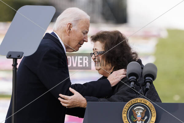 Jeanne White-Ginder, mother of AIDS victim Ryan White, is comforted by United States President Joe Biden during an event to commemorate World AIDS Day on the South Lawn of the White House in Washington, DC, US, on Sunday, Dec. 1, 2024. Biden is unveiling the AIDS Memorial Quilt to recognize those who have died due to AIDS-related illnesses.