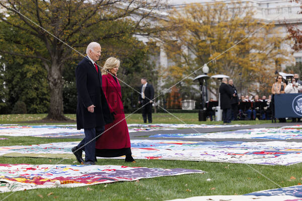 United States President Joe Biden and first lady Dr. Jill Biden view the AIDS Memorial Quilt on the South Lawn during an event to commemorate World AIDS Day on the South Lawn of the White House in Washington, DC, US, on Sunday, Dec. 1, 2024. Biden is unveiling the AIDS Memorial Quilt to recognize those who have died due to AIDS-related illnesses
