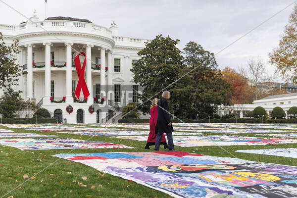 United States President Joe Biden and first lady Dr. Jill Biden view the AIDS Memorial Quilt on the South Lawn during an event to commemorate World AIDS Day on the South Lawn of the White House in Washington, DC, US, on Sunday, Dec. 1, 2024. Biden is unveiling the AIDS Memorial Quilt to recognize those who have died due to AIDS-related illnesses