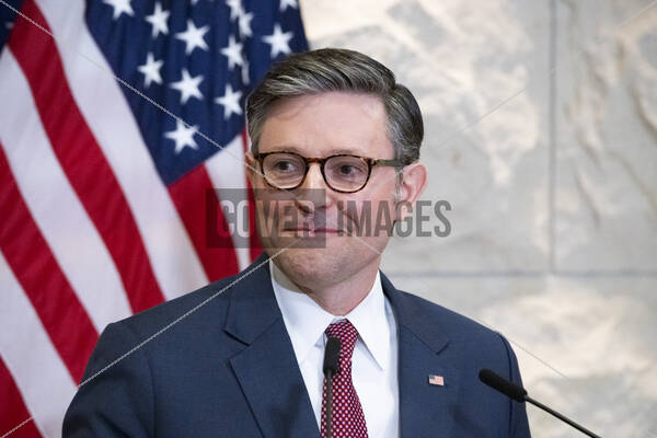 Speaker of the US House of Representatives Mike Johnson (Republican of Louisiana) speaks to reporters before entering the Department of Government Efficiency (DOGE) meeting with Elon Musk, Vivek Ramaswamy and several GOP members, among others, at the Capitol Visitor Center