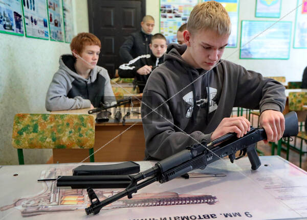 Students learn how to handle firearms at the Boryspil Professional College, a centre for teaching the "Defence of Ukraine" subject, Boryspil, Kyiv region, northern Ukraine.