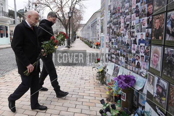 Defence Secretary John Healey (left) with Serhii Boyev, Deputy Minister of Defence of Ukraine for European Integration, laying flowers at the Wall of Remembrance of the Fallen for Ukraine, which remembers those killed during the conflict with Russia, during a visit to Kyiv