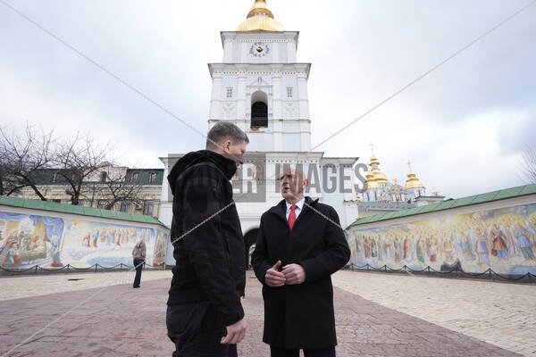 Defence Secretary John Healey (right) talks with Serhii Boyev, Deputy Minister of Defence of Ukraine for European Integration, in front of St Michael's Golden Domed Monastery, St Michael's Square, during a visit to Kyiv