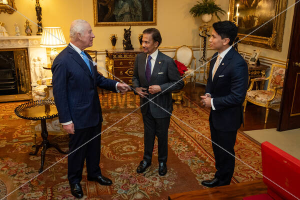 King Charles III during a meeting with the Sultan of Brunei Darussalam, Hassanal Bolkiah accompanied by Prince Mateen of Brunei Darussalam in the 18th Century room at Buckingham Palace in London