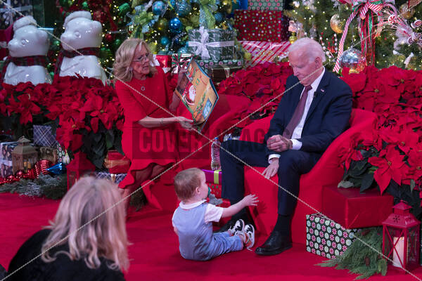 First lady Dr. Jill Biden reads from Twas the Night Before Christmas while United States President Joe Biden plays with John “Reuben” Unkovic during a holiday visit to patients and families at Children’s National Hospital in Washington