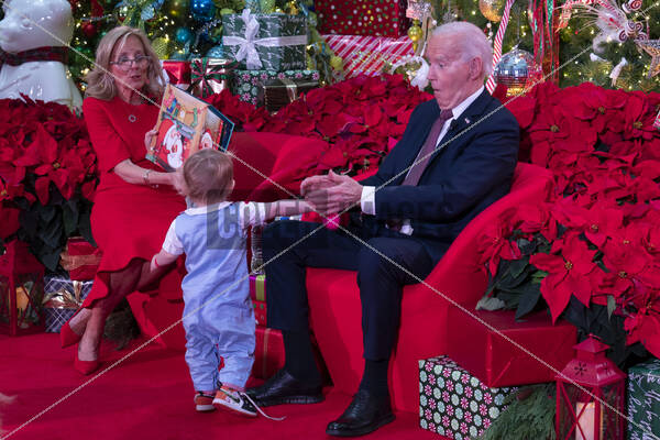 First lady Dr. Jill Biden reads from Twas the Night Before Christmas while United States President Joe Biden plays with John “Reuben” Unkovic during a holiday visit to patients and families at Children’s National Hospital in Washington