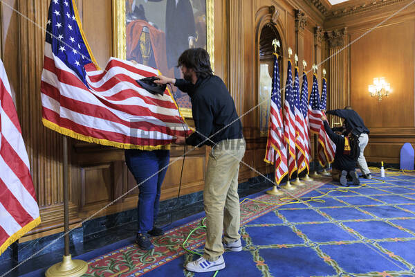 A staff member irons the American flag outside the Opening of the 119th Congress in the House Chambers of the Capitol Building in Washington DC on Friday, January 3, 2025. Republicans re-elected Mike Johnson to Speaker of the House after conservative holdouts changed their votes to Johnson.