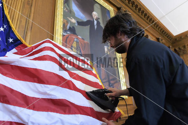 A staff member irons the American flag outside the Opening of the 119th Congress in the House Chambers of the Capitol Building in Washington DC on Friday, January 3, 2025. Republicans re-elected Mike Johnson to Speaker of the House after conservative holdouts changed their votes to Johnson.