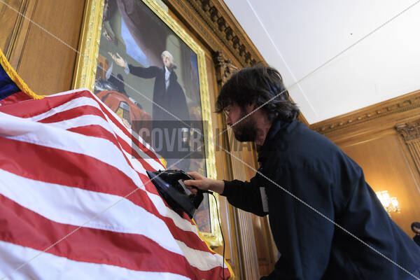 A staff member irons the American flag outside the Opening of the 119th Congress in the House Chambers of the Capitol Building in Washington DC on Friday, January 3, 2025. Republicans re-elected Mike Johnson to Speaker of the House after conservative holdouts changed their votes to Johnson.