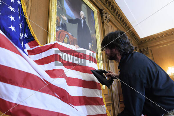 A staff member irons the American flag outside the Opening of the 119th Congress in the House Chambers of the Capitol Building in Washington DC on Friday, January 3, 2025. Republicans re-elected Mike Johnson to Speaker of the House after conservative holdouts changed their votes to Johnson.