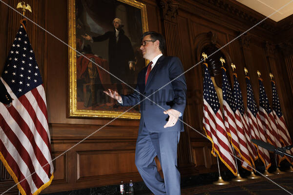 Speaker of the US House of Representatives Mike Johnson (Republican of Louisiana) is seen during swearing-in reenactment photos in the Rayburn Room of the Capitol Building in Washington, DC during the opening of the 119th Congress. Speaker Johnson was re-elected Speaker after conservative GOP holdouts changed their votes at the last minute.