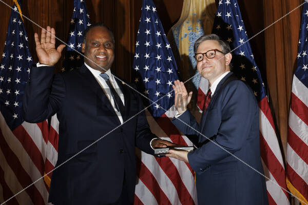 US Representative Jonathan Jackson (Democrat of Illinois) during swearing-in reenactment photos in the Rayburn Room of the Capitol Building in Washington, DC during the opening of the 119th Congress. Speaker Johnson was re-elected Speaker after conservative GOP holdouts changed their votes at the last minute.