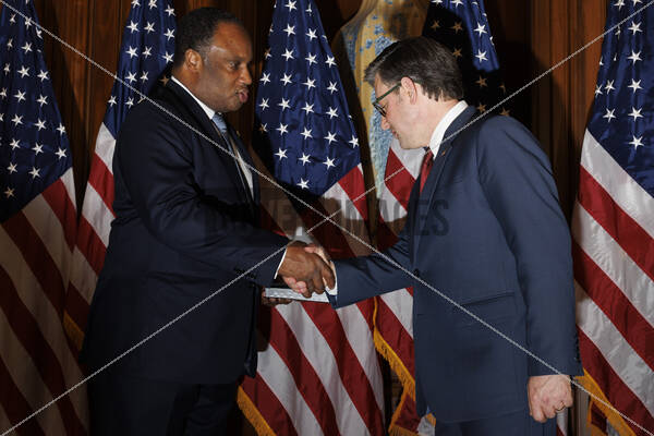 US Representative Jonathan Jackson (Democrat of Illinois) during swearing-in reenactment photos in the Rayburn Room of the Capitol Building in Washington, DC during the opening of the 119th Congress. Speaker Johnson was re-elected Speaker after conservative GOP holdouts changed their votes at the last minute.