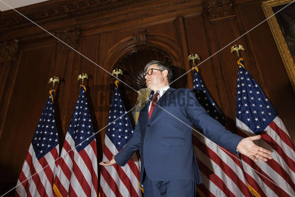 Speaker of the US House of Representatives Mike Johnson (Republican of Louisiana) is seen during swearing-in reenactment photos in the Rayburn Room of the Capitol Building in Washington, DC during the opening of the 119th Congress. Speaker Johnson was re-elected Speaker after conservative GOP holdouts changed their votes at the last minute.