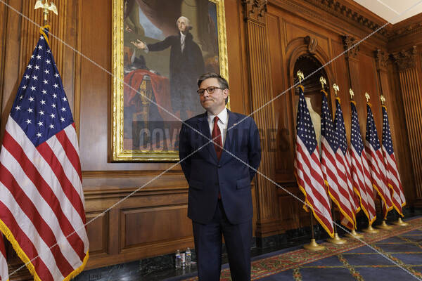 Speaker of the US House of Representatives Mike Johnson (Republican of Louisiana) is seen during swearing-in reenactment photos in the Rayburn Room of the Capitol Building in Washington, DC during the opening of the 119th Congress. Speaker Johnson was re-elected Speaker after conservative GOP holdouts changed their votes at the last minute.