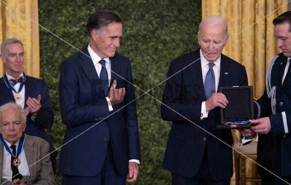 United States President Joe Biden presents former US Senator Mitt Romney (Republican of Utah), son of businessman and former governor George Romney (awarded posthumously) with the Presidential Medal of Freedom during a ceremony in the East Room of the White House on Saturday January 4, 2025. The Presidential Medal of Freedom is the Nation’s highest civilian honor, presented to individuals who have made exemplary contributions to the prosperity, values, or security of the United States, world peace, or other significant societal, public or private endeavors