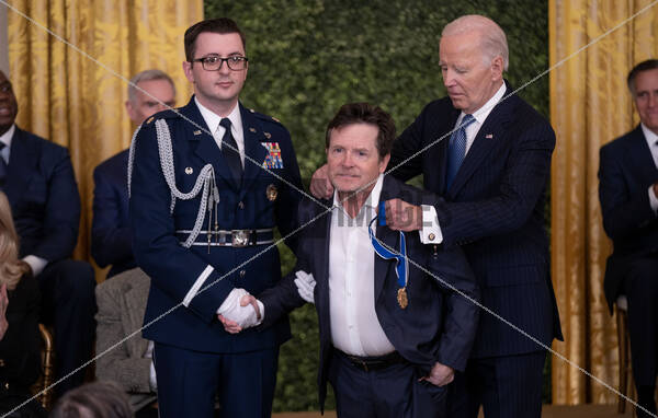 United States President Joe Biden presents actor and advocate Michael J. Fox with the Presidential Medal of Freedom during a ceremony in the East Room of the White House on Saturday January 4, 2025. The Presidential Medal of Freedom is the Nation’s highest civilian honor, presented to individuals who have made exemplary contributions to the prosperity, values, or security of the United States, world peace, or other significant societal, public or private endeavors