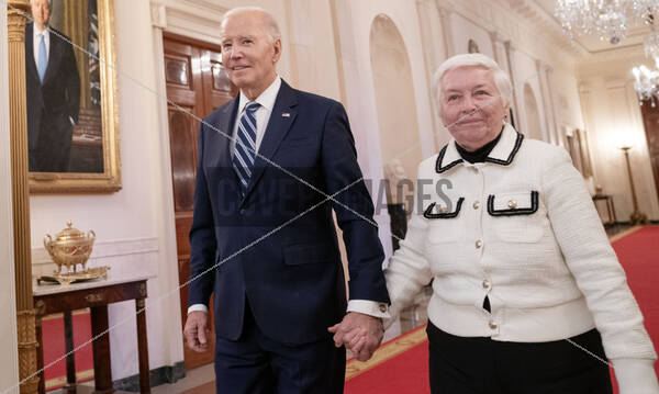 United States President Joe Biden walks in to the East Room with Bette Marino, President of the Connecticut Chapter of the Alliance for Retired Americans, prior to signing the Social Security Fairness Act in the East Room of the White House