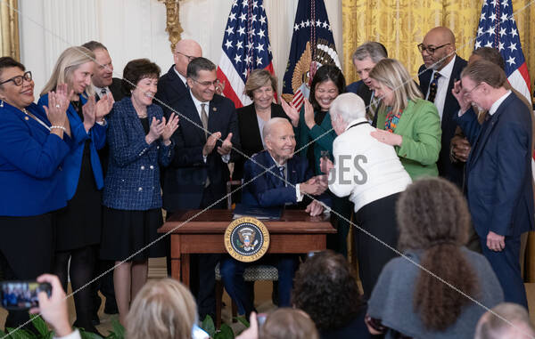 United States President Joe Biden shakes hands with Bette Marino, President of the Connecticut Chapter of the Alliance for Retired Americans, after signing the Social Security Fairness Act in the East Room of the White House