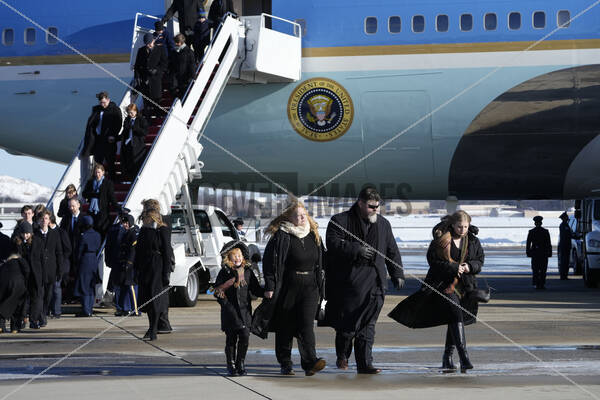 Members of the Carter family arrive on Special Air Mission 39 before the flag-draped casket of former United States President Jimmy Carter is taken from the plane at Joint Base Andrews, Maryland, Tuesday, January 7, 2025. Carter died Dec. 29, at the age of 100