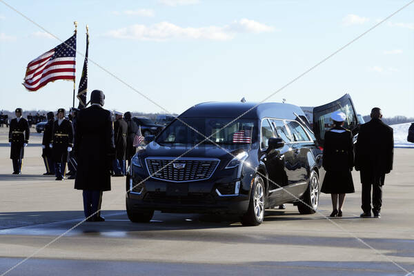 The flag-draped casket of former President Jimmy Carter is placed into the hearse at Joint Base Andrews, Md., Tuesday, Jan. 7, 2025. Carter died Dec. 29, at the age of 100