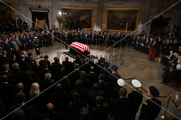 WASHINGTON, DC - JANUARY 7: Former President Jimmy Carter lies in state during a ceremony in the Rotunda of the US Capitol on January 7, 2025 in Washington, D.C. His body will lie in state in the Capitol Rotunda until his funeral Thursday at Washington National Cathedral.