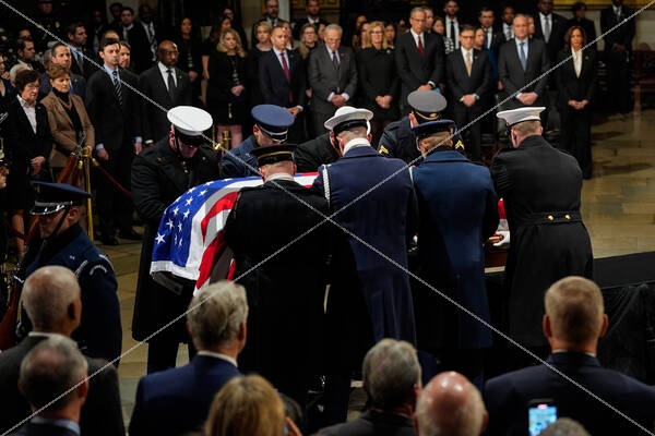 The casket of the late former US President Jimmy Carter arrives in the Rotunda of the US Capitol in Washington, DC, US, on Tuesday, Jan. 7, 2025. Carter, the former Georgia peanut farmer who, as president, brokered a historic peace accord between Israel and Egypt despite a term marked by inflation, an oil crisis, and the Iran hostage crisis died on December 29 at the age of 100.