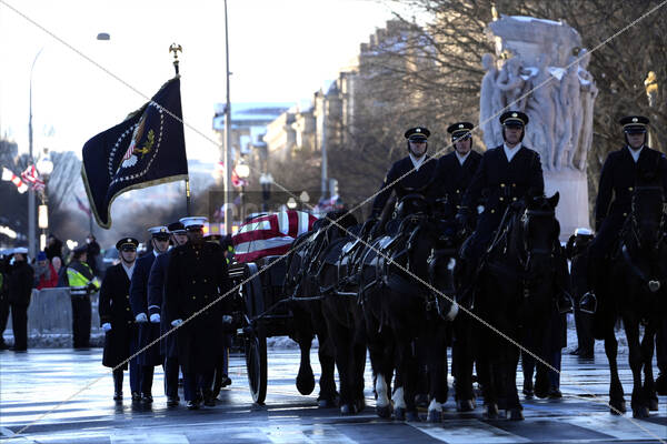 The casket containing the remains of former President Jimmy Carter moves toward the U.S. Capitol on a horse-drawn caisson in Washington, Tuesday, Jan. 7, 2025. Carter died Dec. 29, 2024, at the age of 100